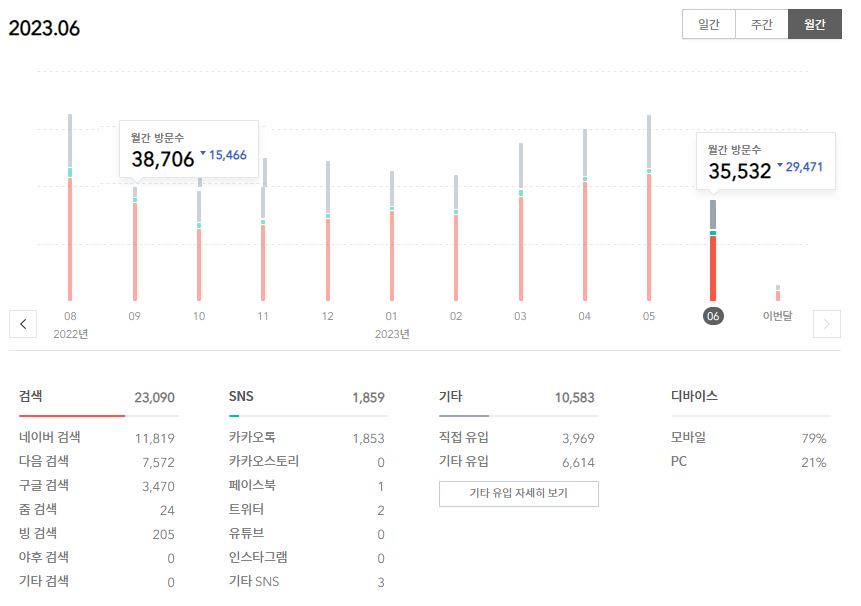 그로 인해 저는 1일1포스팅을 그대로 했는데도 방문자수가 반토막이상이 난 35532회를 기록했습니다