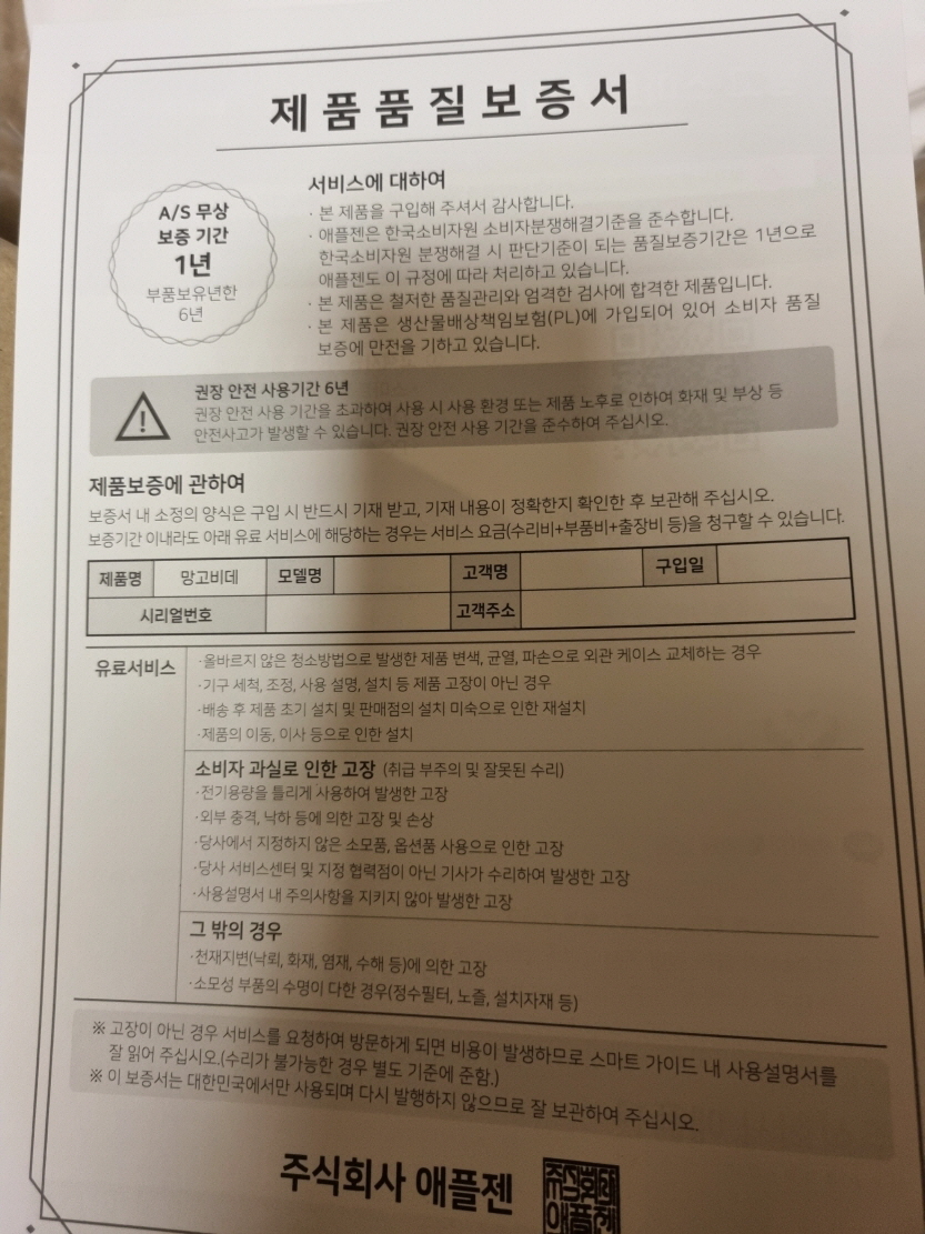 비데는 애플젠이라는 회사가 담당하나봐요 제품보증서가 있는게 뭐 크게 의미있나 싶습니다