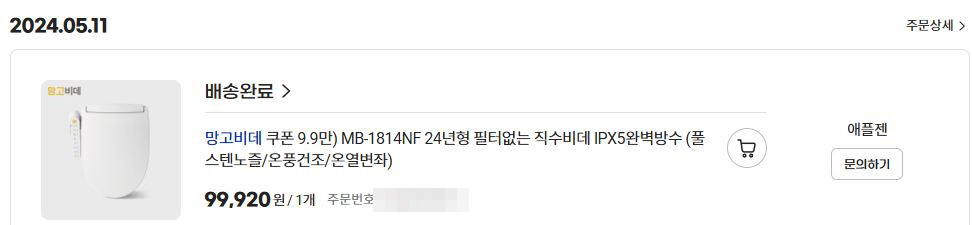 저는 2024년 5월에 지마켓 핫딜가로 망고비데 MB-!814NF를 99920원에 구매했답니다 2만원정도 할인해서 샀다고 볼수 있겠죠 다만 가격이 할인되는 만큼 설치는 셀프로 해야했답니다