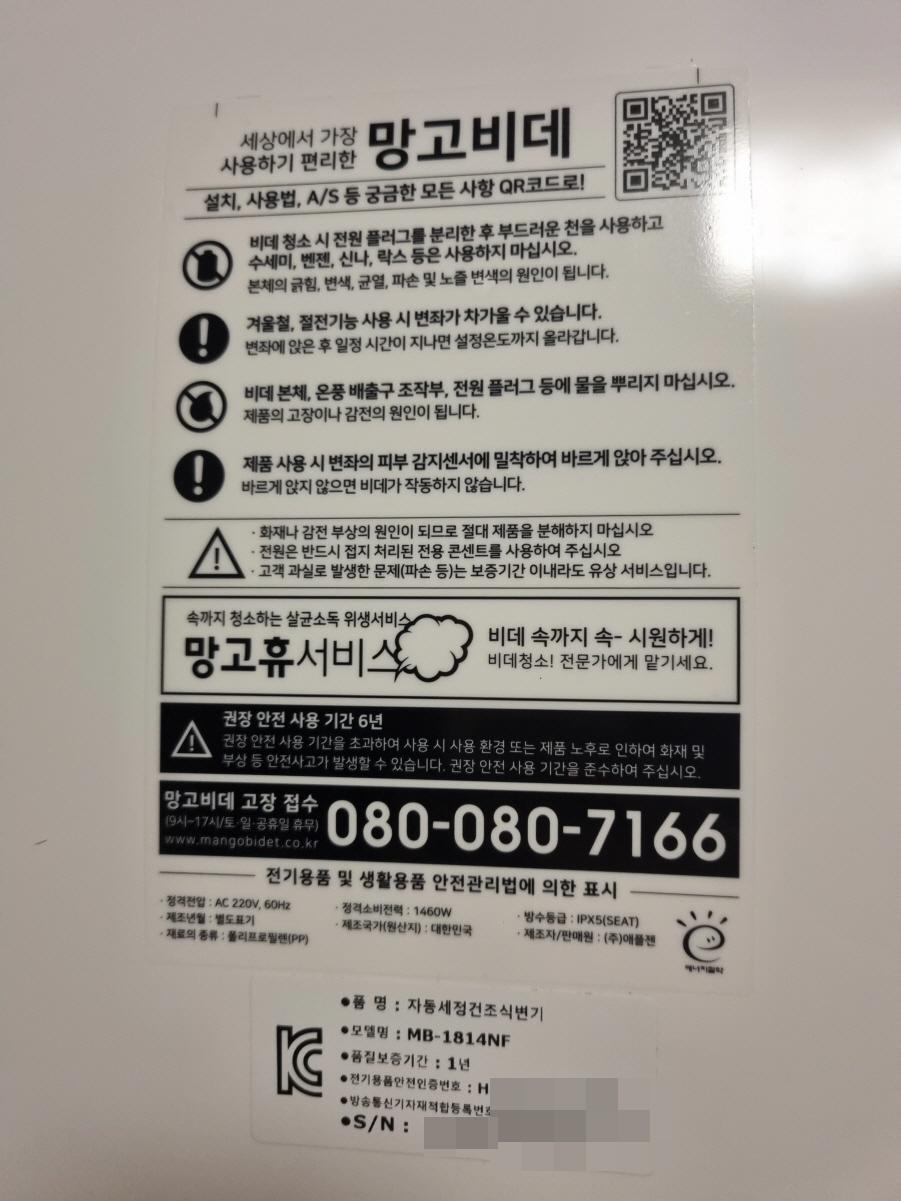 품질보증기간, 제품번호등이 써있고 망고비데 AS센터 전화번호, 주의사항등이 써있습니다