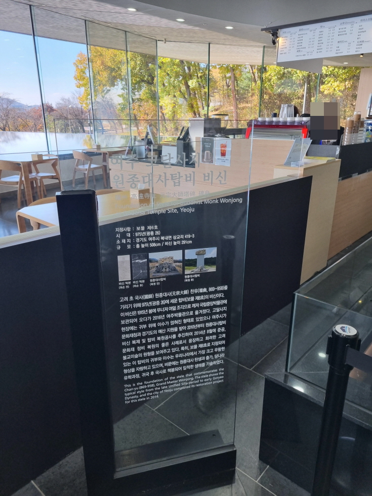 1층에는 여주 청춘카페 카페테리아가 있고 원종대사탑비 비신이 있고 로비전시홀이 있습니다 2층에는 여주역사실로 향토역사를 설명해주는 전시관이 있습니다