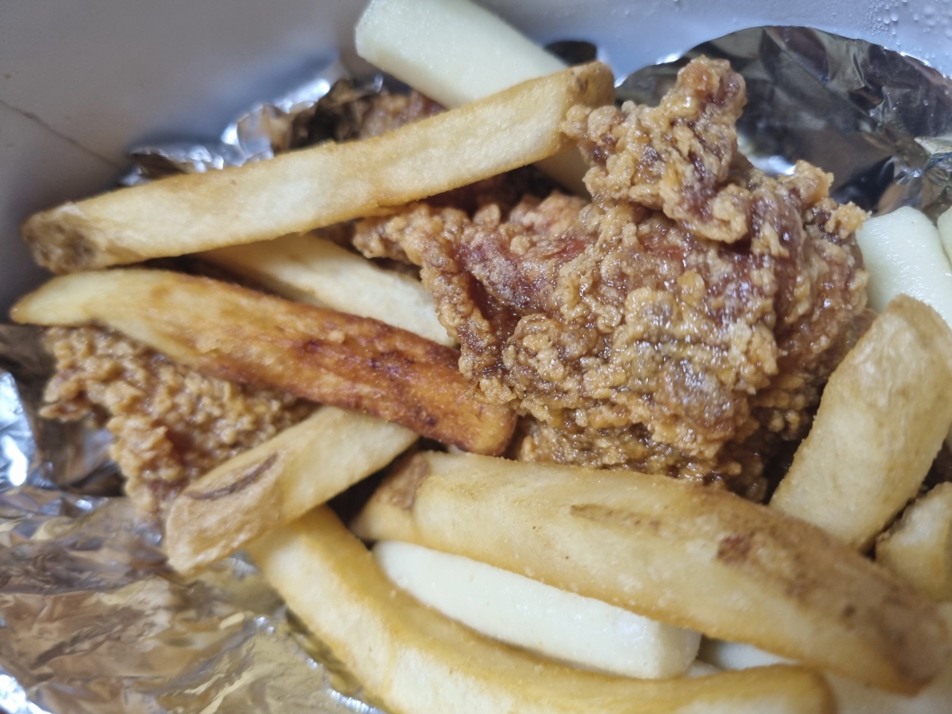 치킨말고도 골뱅이무침이나 투움바떡볶이, 버팔로윙이나 감자튀김, 오뎅탕, 닭강정, 먹태, 쥐포등의 안주류가 있고 카스 생맥주와 레드락 생맥주, 1664블랑등의 맥주가 있습니다