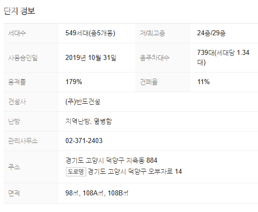 총 549세대 5개동으로 최고29층 최저24층 2019년에 준공되었으며 총주차대수는 739대로 1.34대입니다