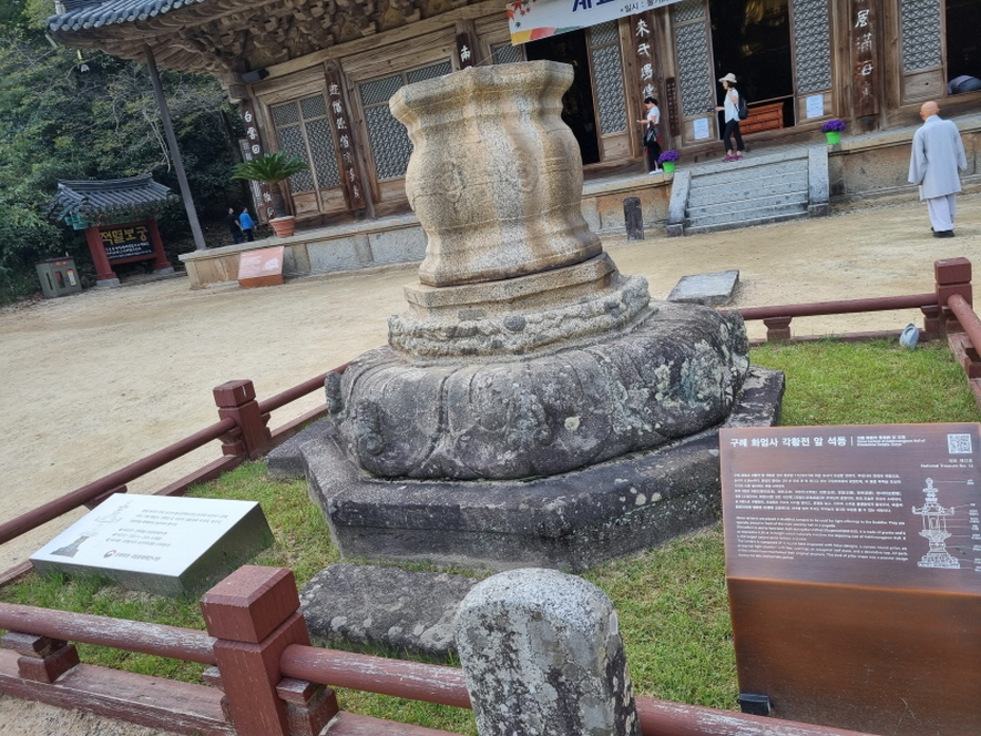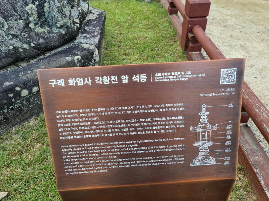 국보12호인 각황전 앞 석등은 677년 신라 문무왕 17년에 의상 조사가 조성한 것으로 우리나라 최대의 석등으로 높이가 6.36m나 된다고 합니다 꽃잎의 형태는 3천년에 한번 핀다고 하는 우담바라의 꽃잎이고 꽃의 8잎과 화창, 북의 모습등 모든 석등이 불교와 관련이 깊고 의미가 있다고 합니다