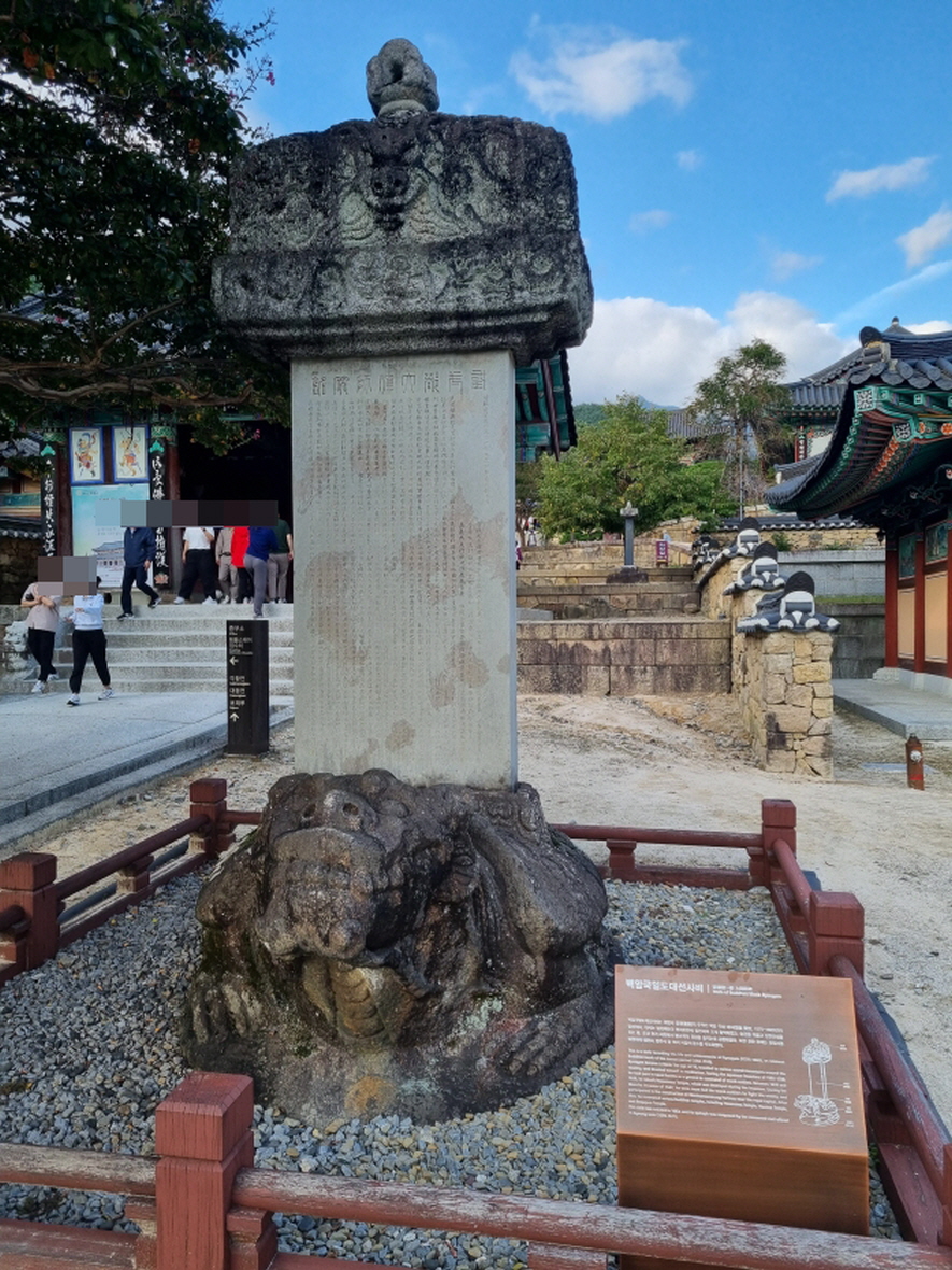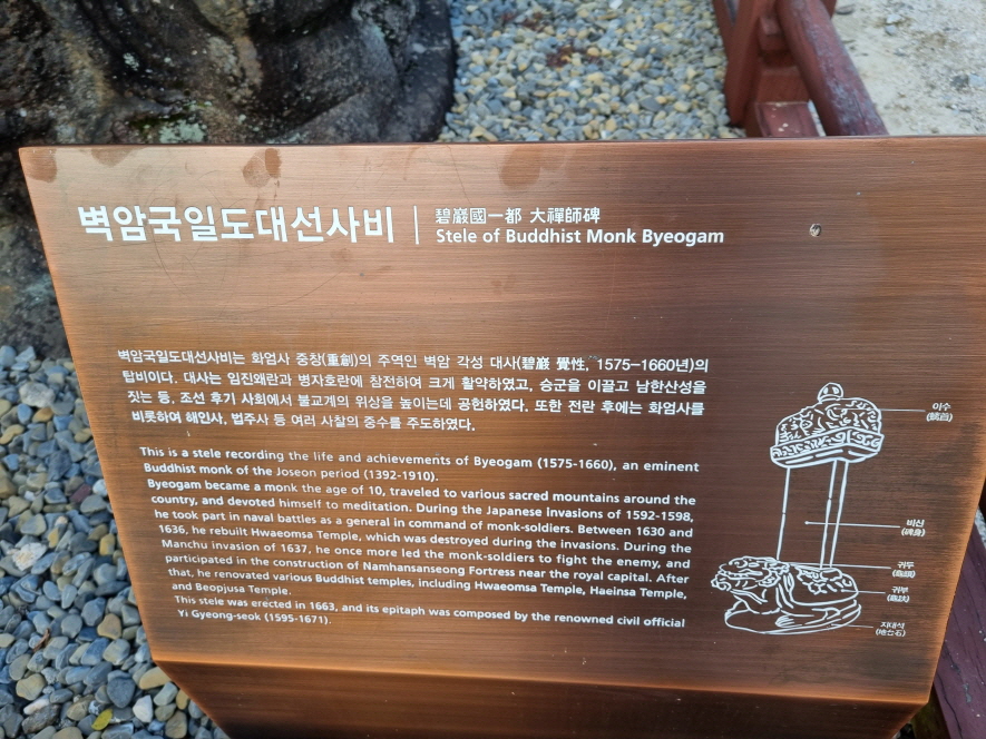 벽암국일도대선사비입니다 화엄사는 불에 타서 다 전소되기도 했는데 화엄사 중창 주역인 벽암 각성대사는 임진왜란과 병자호란에 참전하고 전쟁이 끝난후 여러 사찰의 중수를 주도하였기 때문에 그 공을 기린거 같습니다