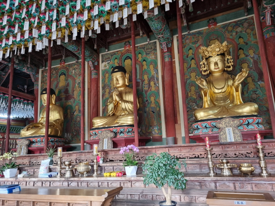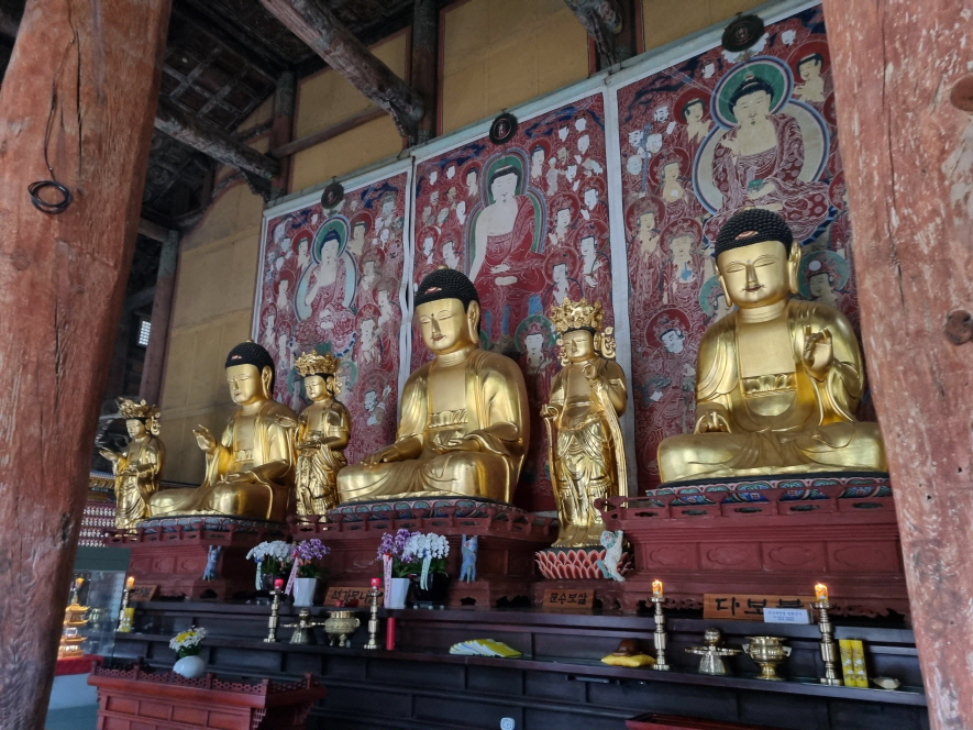 각황은 부처님의 다른 이름입니다 각황전 내부에는 보물2139호인 목조석가여래삼불좌상 및 사보살입상이 있습니다