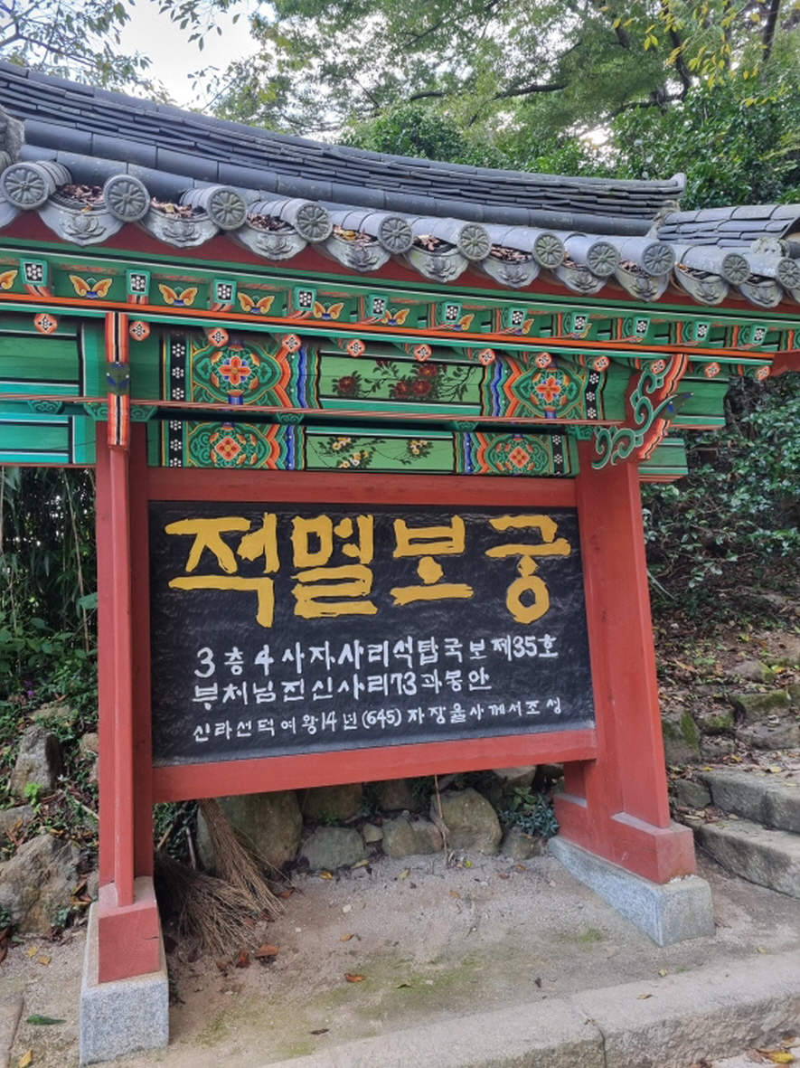 적멸보궁쪽에는 국보 35호인 구례 화엄사 사사자 삼층석탑이 있으며 부처님 진신사리 73과봉안이 되어 있다고 하며 645년 신라 선덕여왕 14년에 자장율사가 조성했다고 합니다