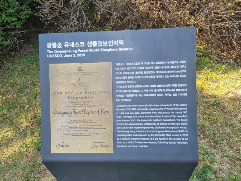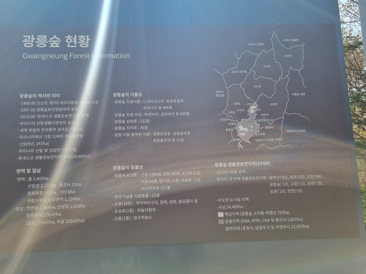 광릉숲은 2010년 유네스코 생물권보전지역으로 등재되었으며 세계 유일의 온대중부 성숙림으로 산림 및 임업연구의 산실이자 면적이나 살아가는 식물과 동물, 곤충들이 엄청나게 많습니다