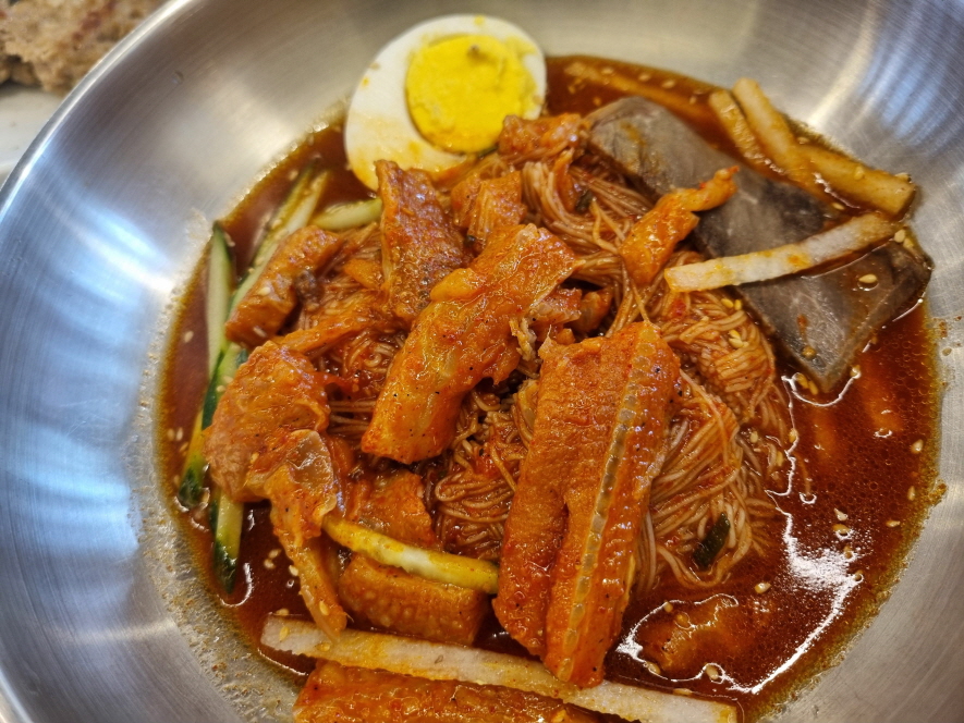 생각보다 회가 많이 올라가서 놀랐습니다 홍어회라곤 하지만 그렇게 냄새나고 그렇진 않구요 오독오독 오돌오돌 씹히는 식감과 회냉면의 양념과 아주 잘 어우러지는 맛이라 만족스러웠습니다 냉면고기도 상태 괜찮았구요