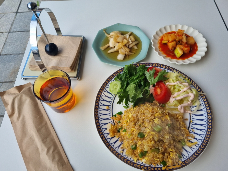 예쁜 그릇들에 정갈하게 담겼고 볶음밥에 샐러드는 참 흔치 않은 조합이네요