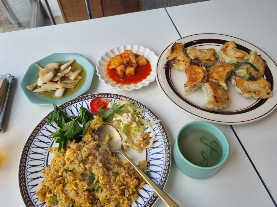 볶음밥 한입...군만두 한입..깍두기 한입..볶음밥 한입...군만두 한입..양파절임 한입..계란국 한입