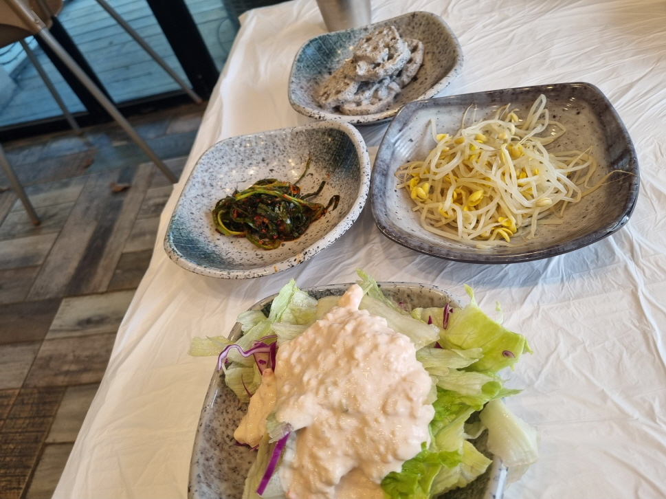 퀄리티좋은 따뜻한 계란찜, 따뜻하고 바삭한 가지튀김, 묵, 샐러드, 연근샐러드, 부추김치등 다양한 밑반찬이 무한리필입니다