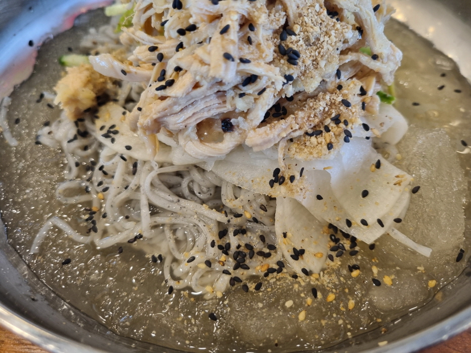 얼음이 둥둥 떠있는 새초롬한 육수에 흑임자면과 흑임자, 초계닭고기, 오이, 무절임이 듬뿍 들어가있는 초계 냉국수를 한그릇하고 오면 속까지 시원하고 건강해지는 느낌이 납니다