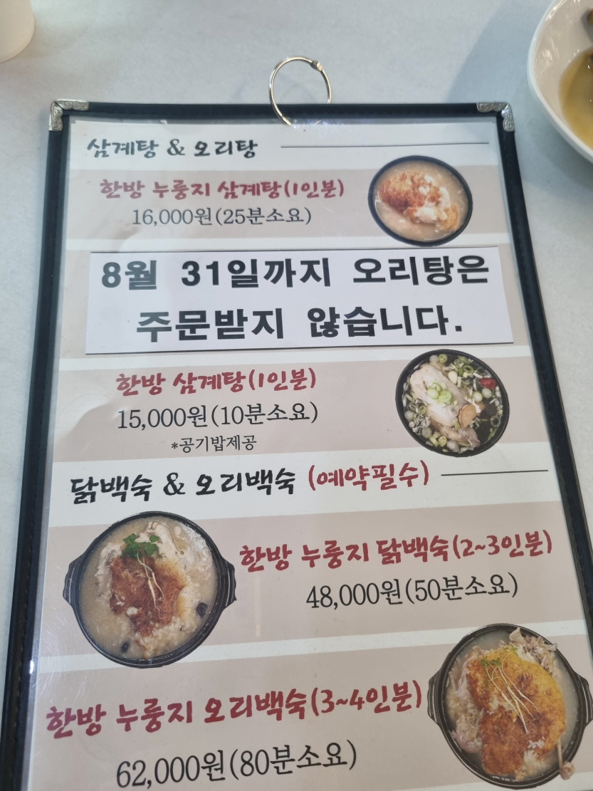 한방 누룽지 닭백숙 2-3인분인데 48000원이고 50분소요, 한방누룽지 오리백숙 3-4인분은 62000원 80분소요 된다고 합니다