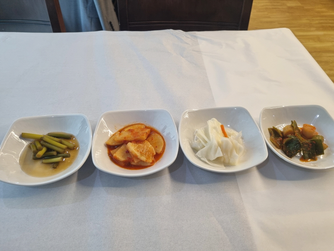 석박지하고 파김치는 아주 적당히 잘 익어서 감칠 맛이 돌았고요 피클도 약간의 느끼함을 덜어주는 느낌이고 마늘쫑도 그랬습니다