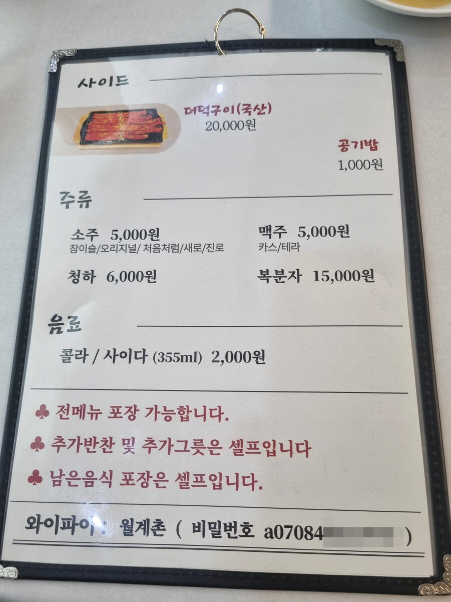 사이드메뉴로는 국산 더덕구이 2만원이 있습니다 오픈할땐 해물파전도 있었던거 같은데 없어졌네요