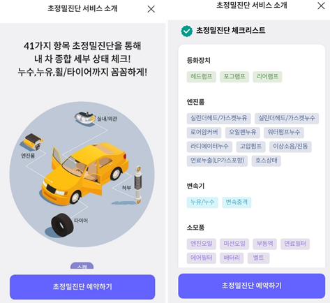 초정밀진단에서는 41가지 항목을 통해 내 차 종합 세부 상태를 꼼꼼하게 관리할 수 있습니다.