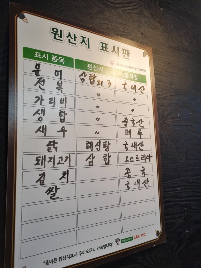 문어와 삼합, 전복, 가리비, 닭, 쌀은 국내산이고 생합이나 새우, 돼지고기, 김치등은 해외산입니다
