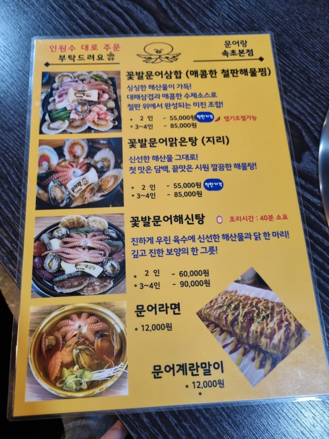 문어랑 속초본점 대표메뉴는 꽃발문어맑은탕과 꽃발문어삼합입니다 문어맑은탕은 지리로 깔끔한 맑은 해물탕이고 꽃발문어삼합은 매콤한 철판해물찜으로 대패삼겹이 있습니다 꽃발문어해신탕도 해산물과 닭이 만났고 조리시간은 40분이 소요된다고 합니다