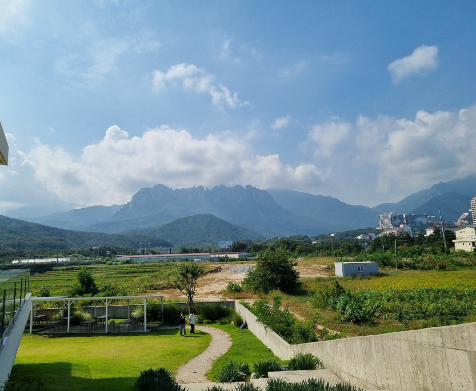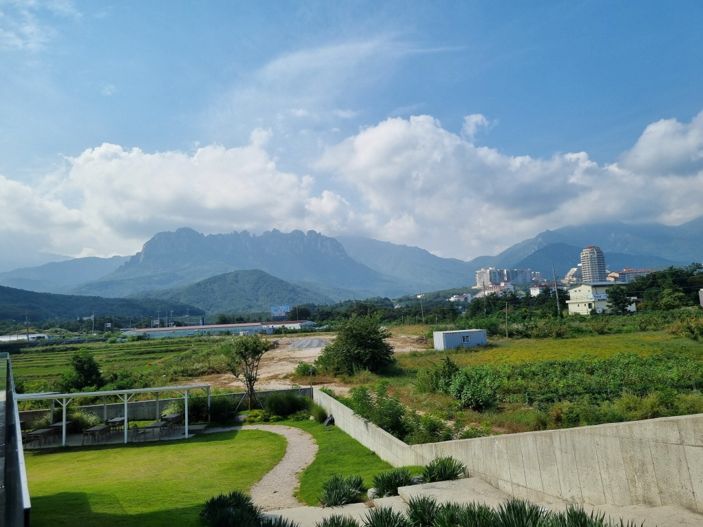 맑은 강원도 하늘과 더불어 설악산의 웅장함과 울산바위의 영령함이 느껴지는 뷰가 펼쳐집니다