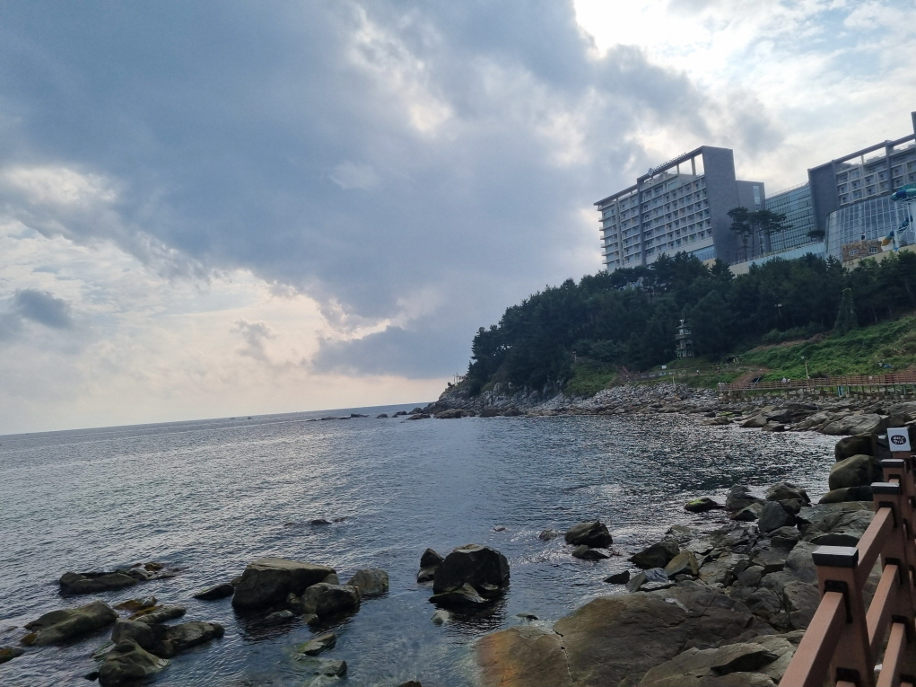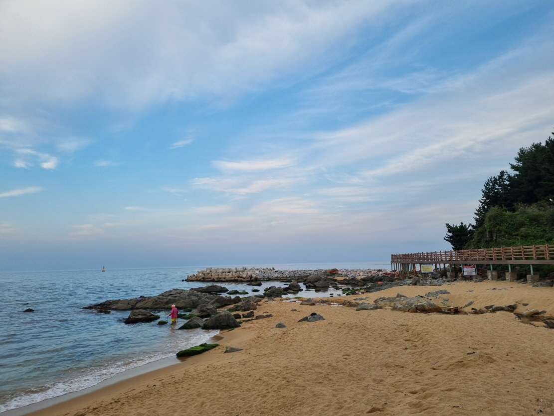 그렇게 사람이 많지도 않고 한적한데다 바다를 보며 유유히 산책할수 있어 힐링되는 오션둘레길 바다향기로가 기억에 많이 남습니다 깨끗한 동해바다에서 수평선을 바라보는 외옹치해수욕장도 아름다웠습니다
