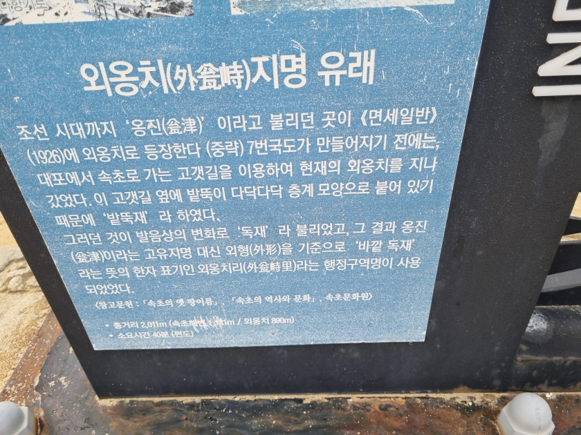 외옹치라는 지명은 조선시대에 옹진이라고 불리던곳이 면세일반에 외옹치로 이름이 등장했다고 하며 이 고갯길 옆에 밭뚝에 층계모양으로 붙어 있어서 밭뚝재라고 불리기도 했다고 합니다 그렇게 부르다가 외옹치리 행정구역명으로 사용되어 외옹치라고 지명이 유래되었다고 합니다 속초해변 거리 2km가 편도 40분으로 거리가 된다고 합니다
