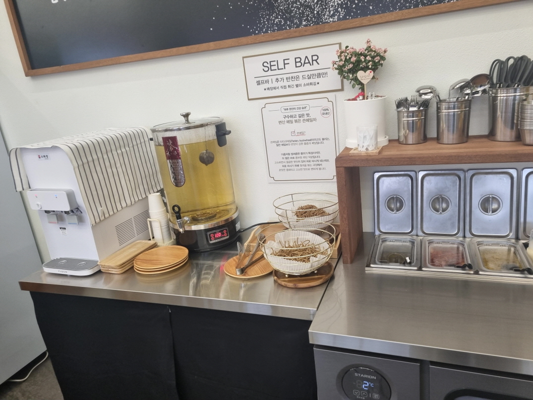 소바랑 셀프바입니다 따뜻한 메밀차도 있고 소바튀김도 있고 밑반찬 리필도 됩니다