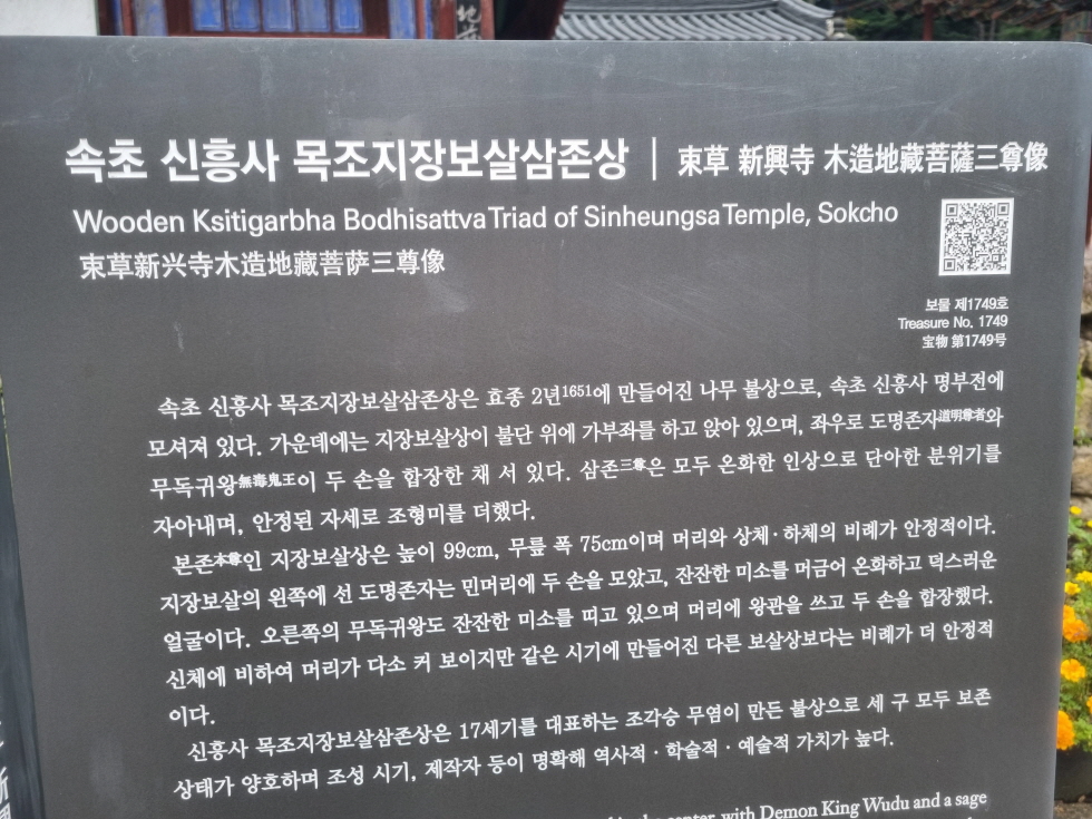 신흥사 명부전은 강원도 유형문화재 166호라고 합니다 조선시대에 만들어진 보물 제1794호 목조지장보살삼존상이 모셔져있다고 합니다 세칸의 창호에는 심오한 사상이 담겨져있다고 하는데 좌우의 창호문은 자신을 낮추고 들어갈수 있게 하심을 유도하는 창호로 이루어져 독특한 형태라고 합니다