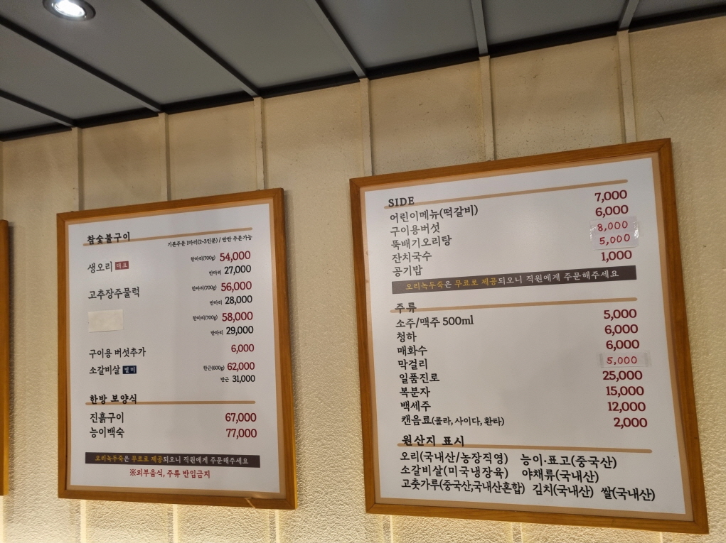 소갈비살도 있고 예약을 해야하는 한방보양식 메뉴로 오리진흙구이와 능이백숙 메뉴가 있습니다