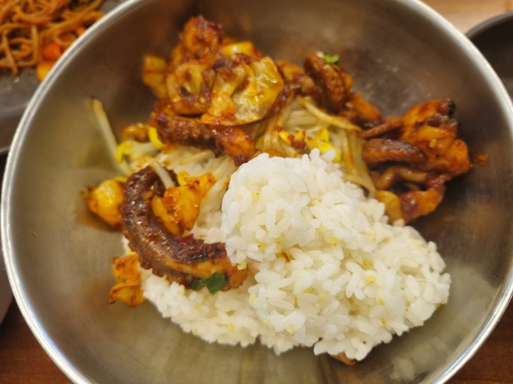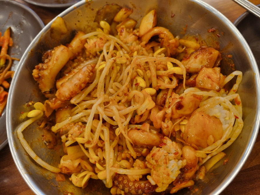 대접공기밥에 쭈꾸미볶음 넣고 콩나물넣고 슥삭슥삭해줍니다