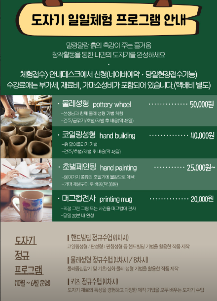 정식 도자기프로그램도 있는데 핸드빌딩, 물레성형, 키즈수업등이 있다고 합니다