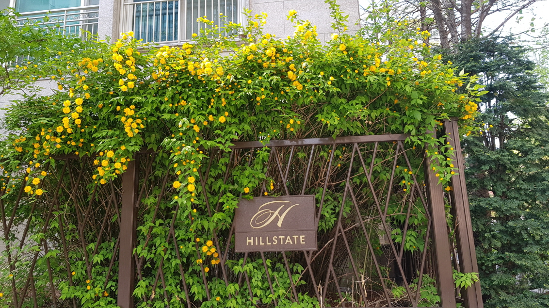 무슨 꽃인지 모르겠는데 예뻐서 찍어봤습니다 힐스테이트 배경으로 되어 있는게 포인트네요