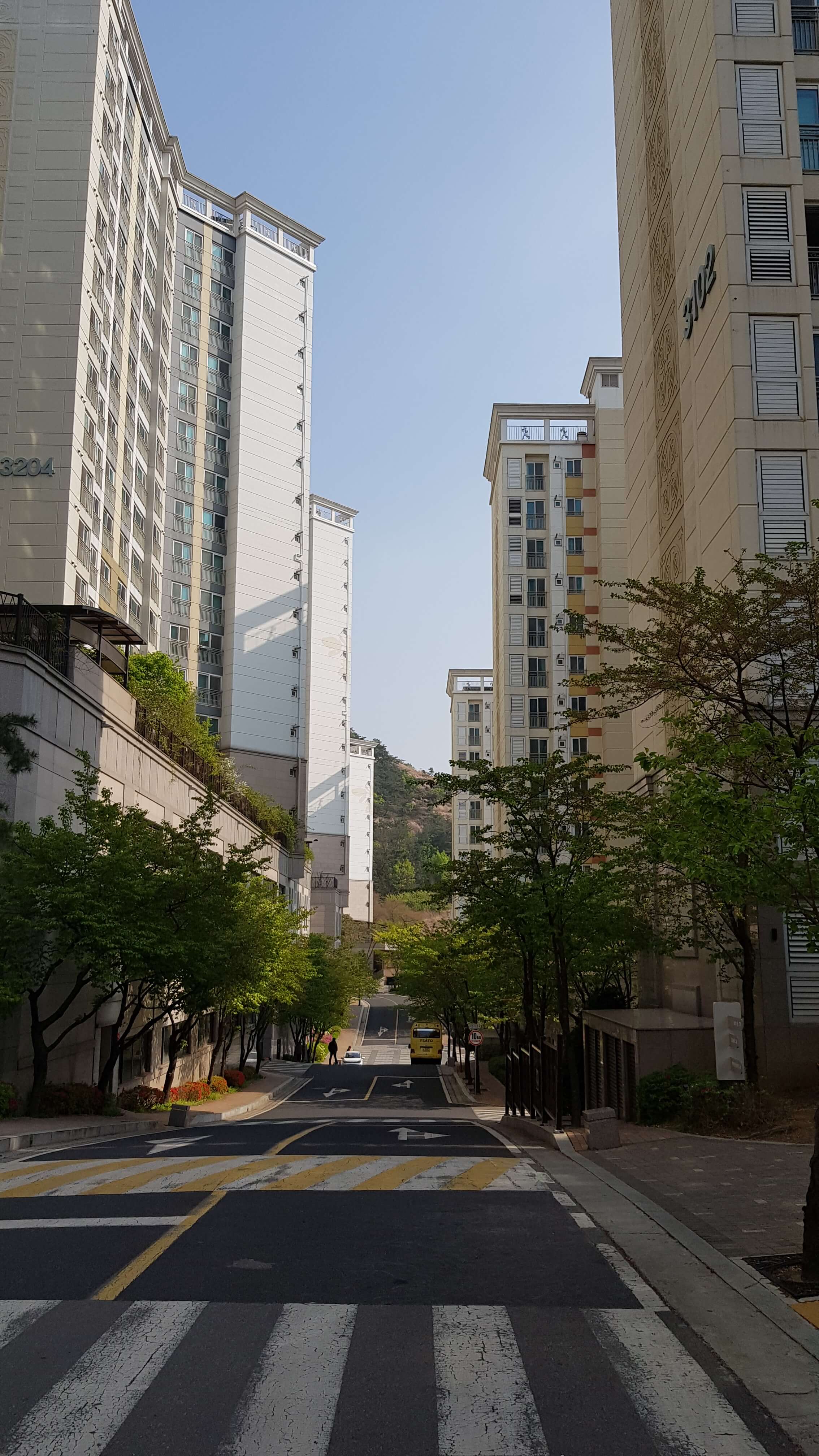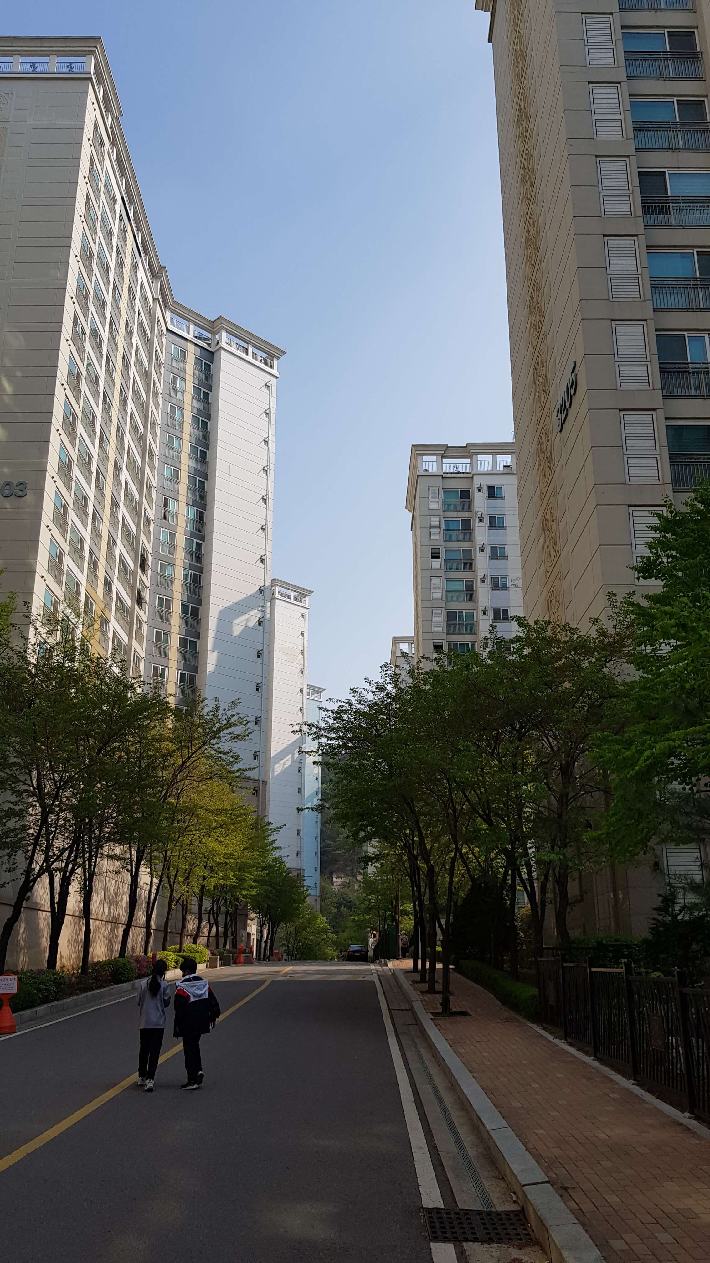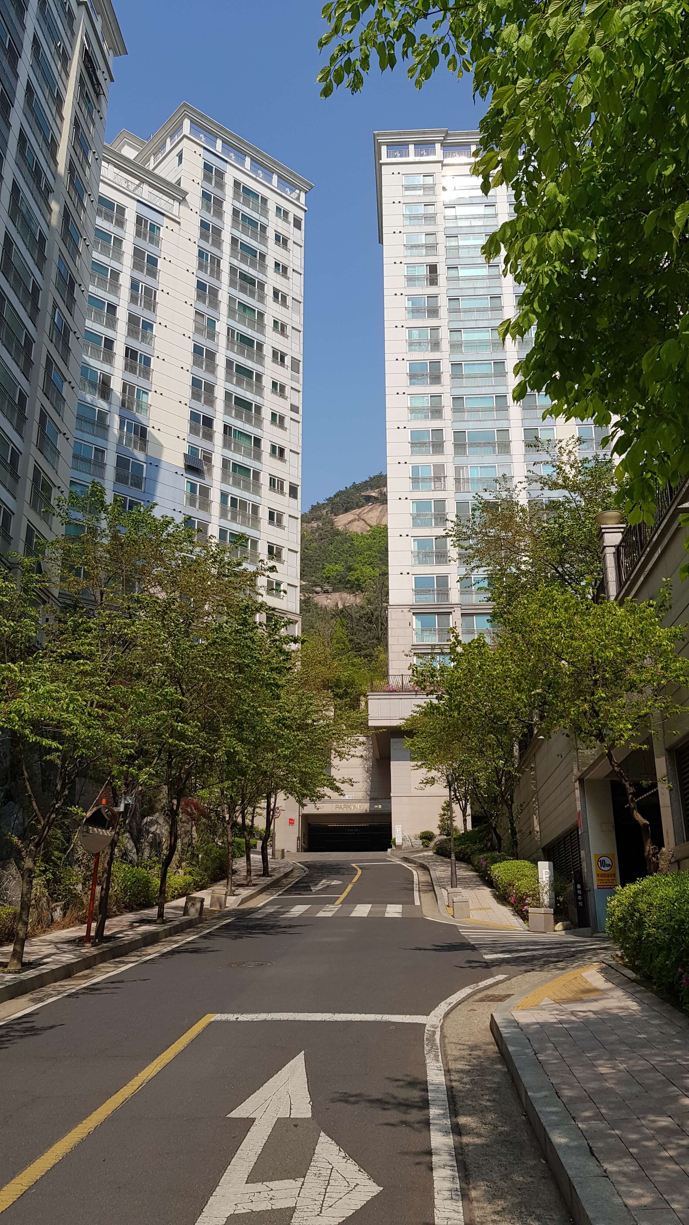 건물이 깨끗하고 웅장해보이죠 판상형이라 중층이상 전망은 앞이 탁 트여있을거 같습니다 경사가 좀 있습니다
