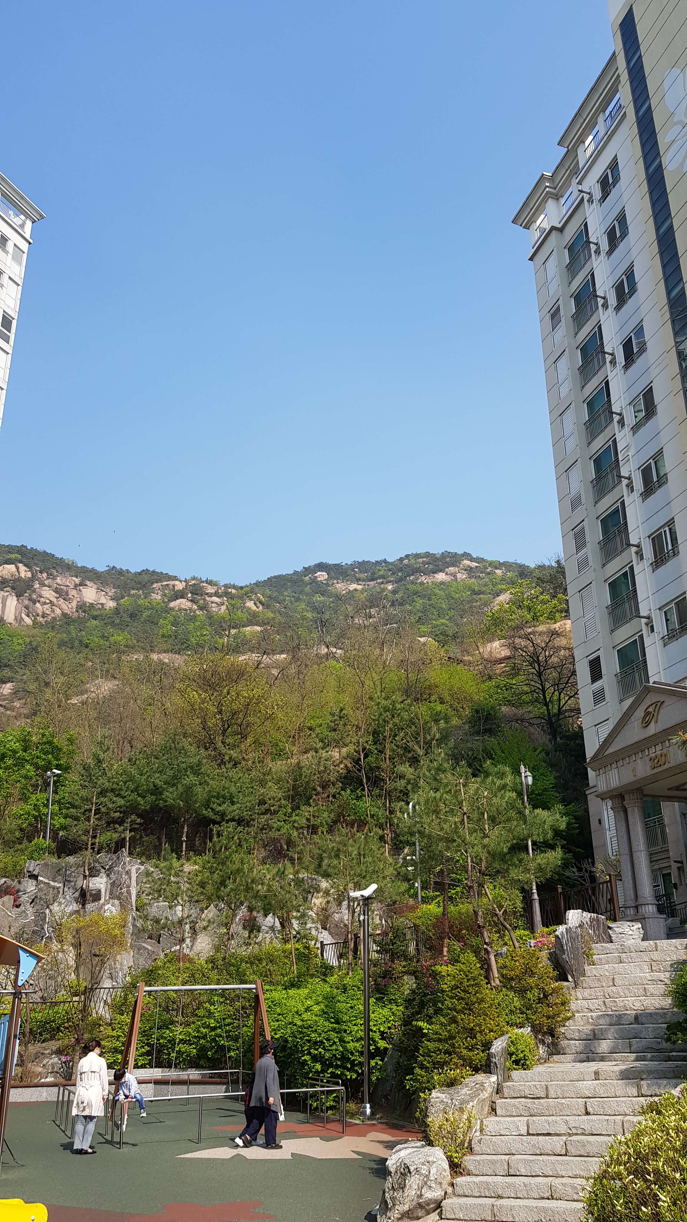 요새 신축아파트에는 별로 없는 놀이터 그네가 반갑네요 단지옆에 바로 산과 숲이 보이십니까?
