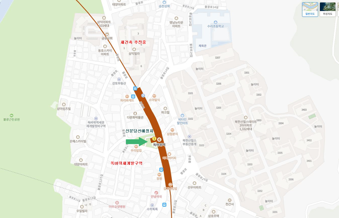 반대편으로는 독바위재개발이 추진되고 있는것으로 알고 있습니다 또 위쪽으로는 삼익빌라가 재건축을 추진중이고요
