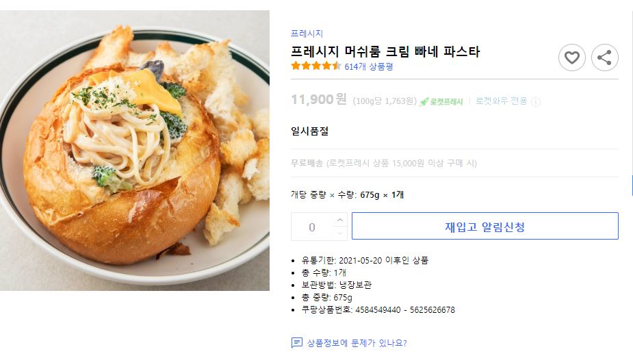 쿠팡에서 소고기를 사다가 저렴해서 구입했어요 프레시지 머쉬룸 크림빠네파스타 9900원 5월구매가