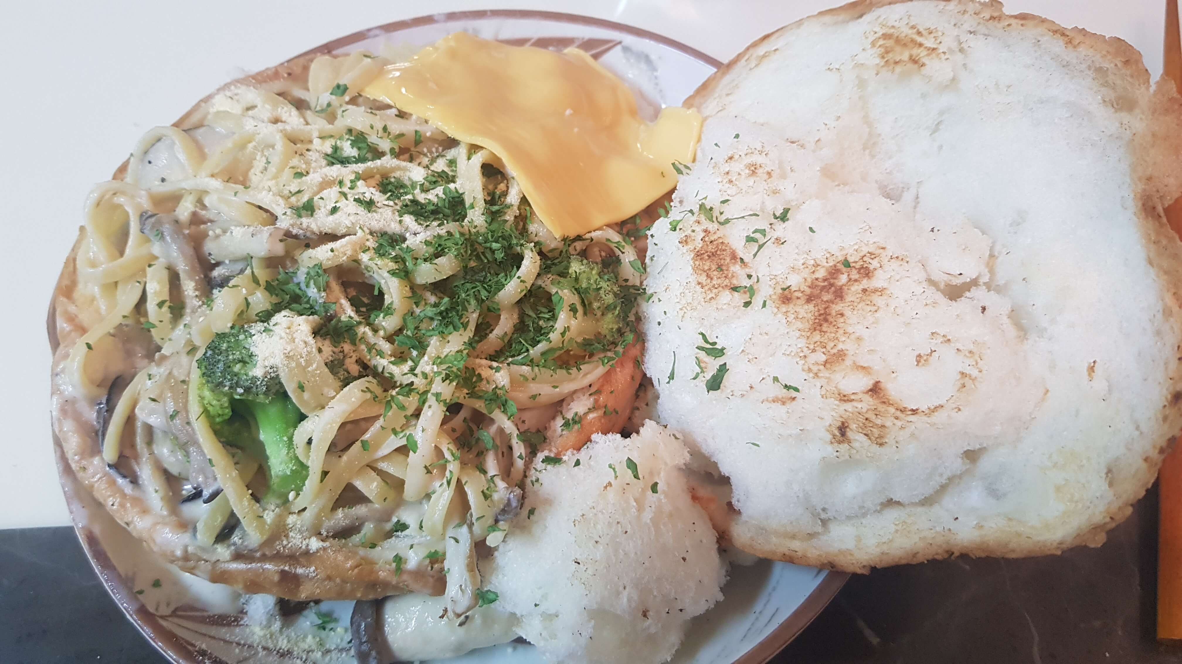 치즈와 크림소스 파마산치즈가루 브로콜리 버섯세종류 파스타와 빠네 허브솔트 파슬리