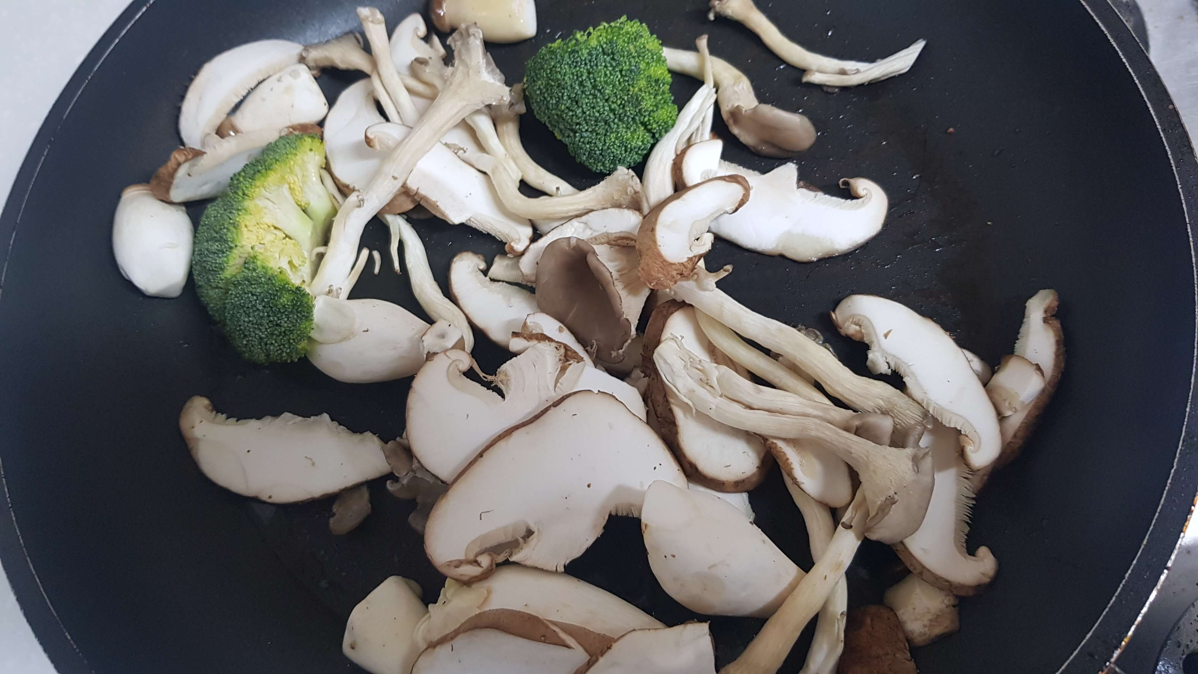 버섯과 브로콜리를 프라이팬에 2분간 볶아줍니다