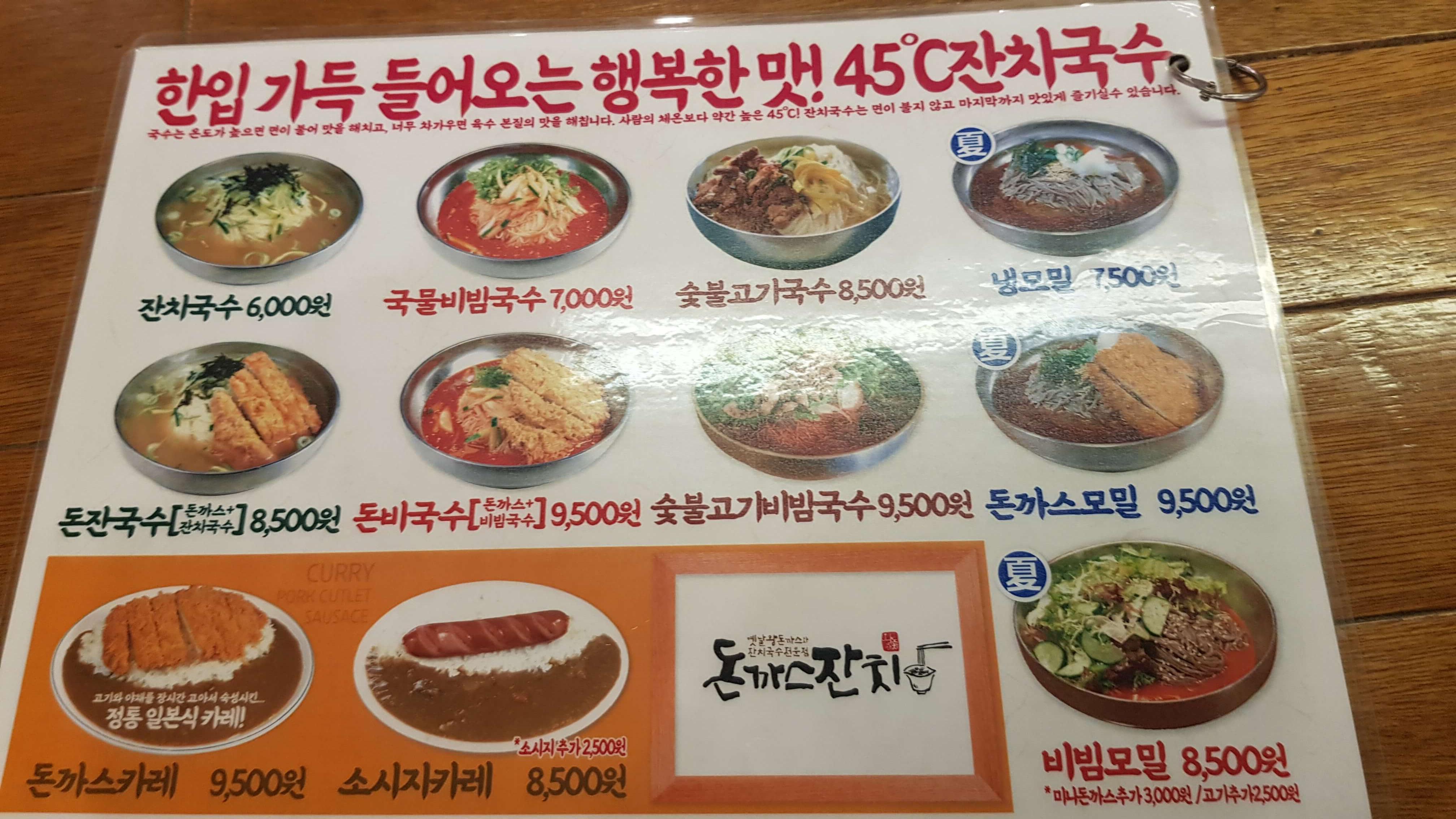 메인인 잔치국수와 돈까스잔치국수, 국물비빔국수, 신메뉴인 숯불고기국수, 냉모밀과 돈까스모밀, 비빔모밀 돈까스카레