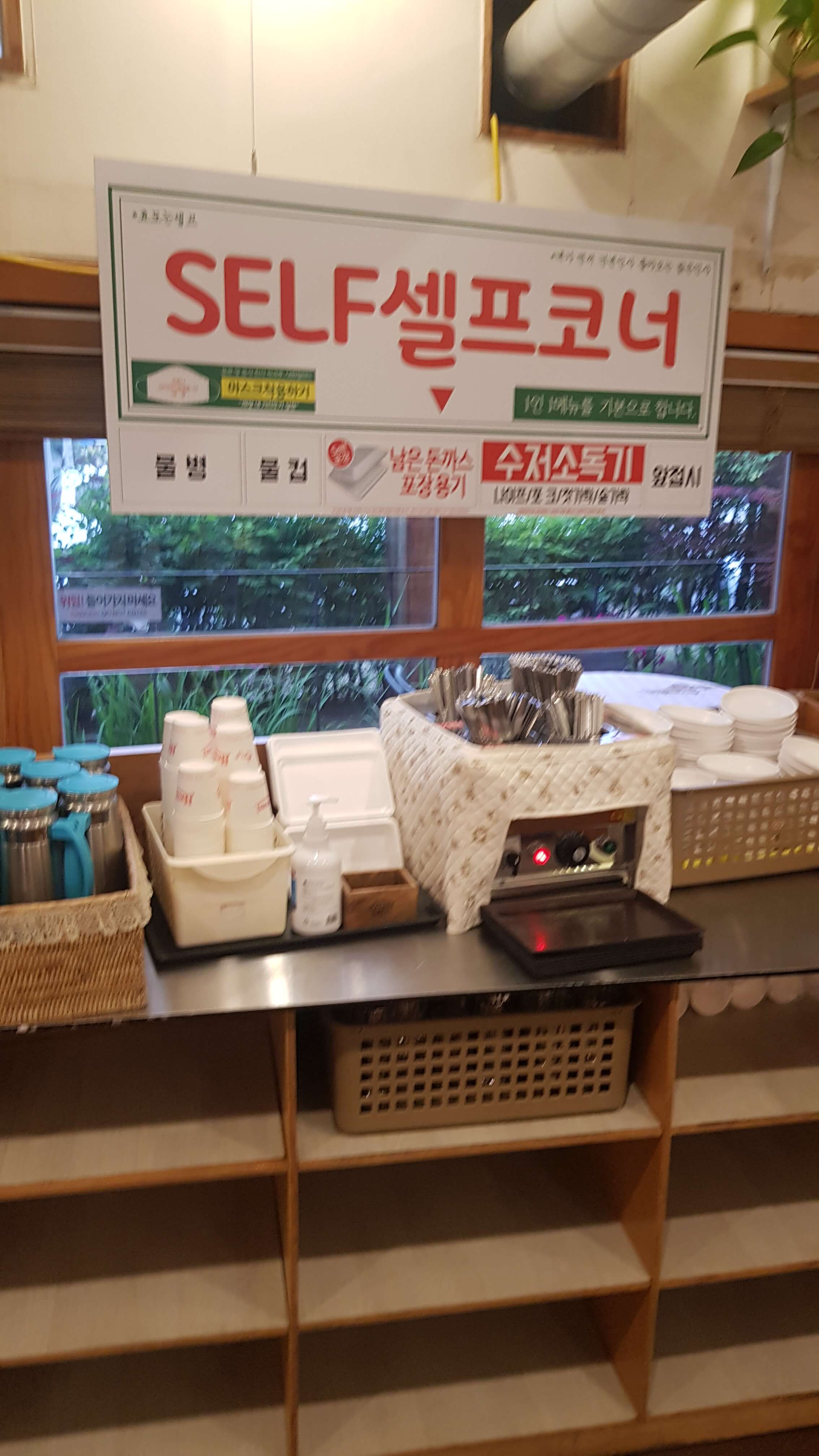 돈까스잔치는 셀프코너가 있어 물은 셀프고요 포장용기도 별도로 마련되어 있습니다