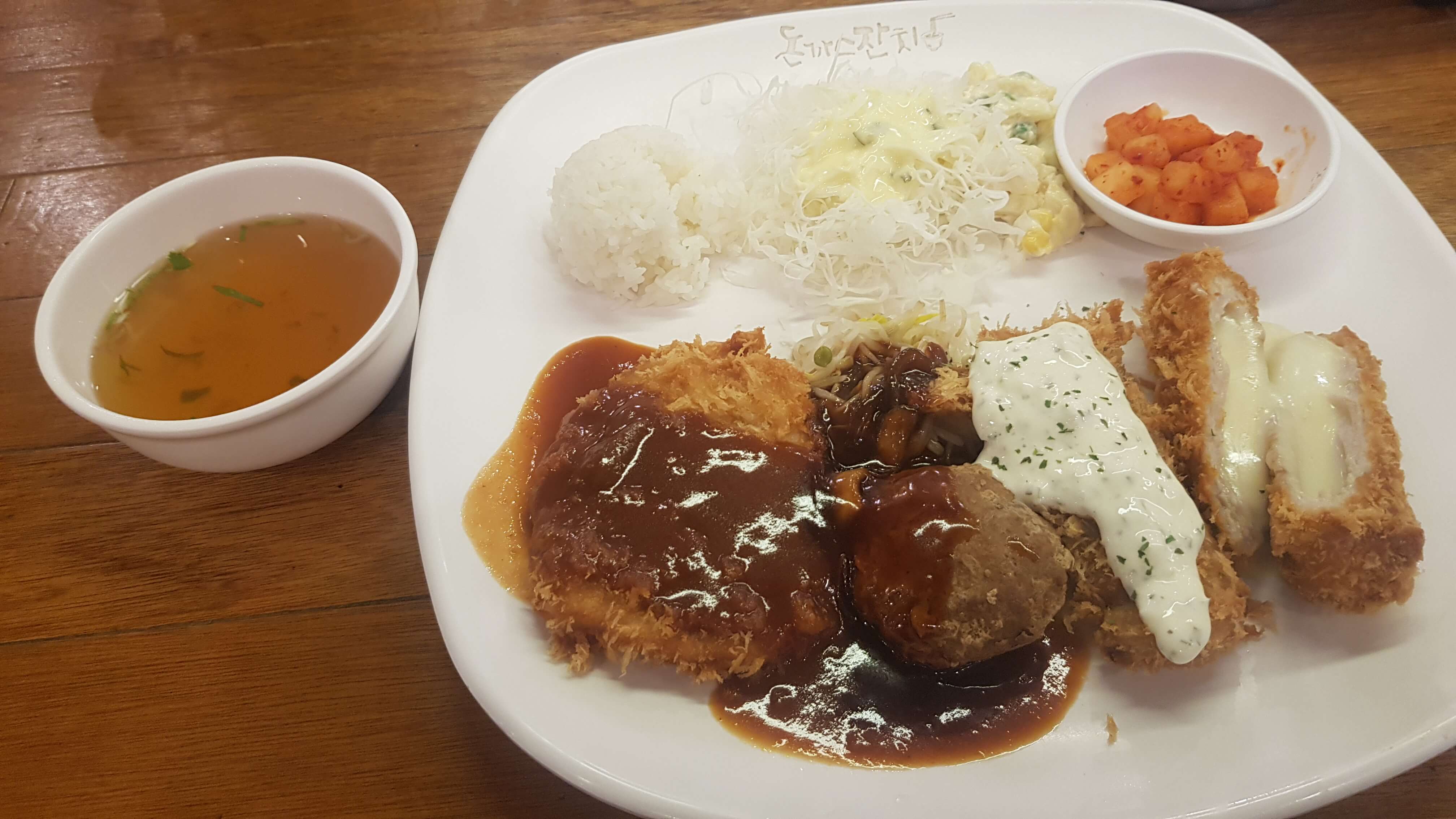 돈까스잔치 모듬정식이 나왔습니다 돈까스 미니함박스테이크 생선까스 치즈돈까스 그리고 멸치육수국물입니다