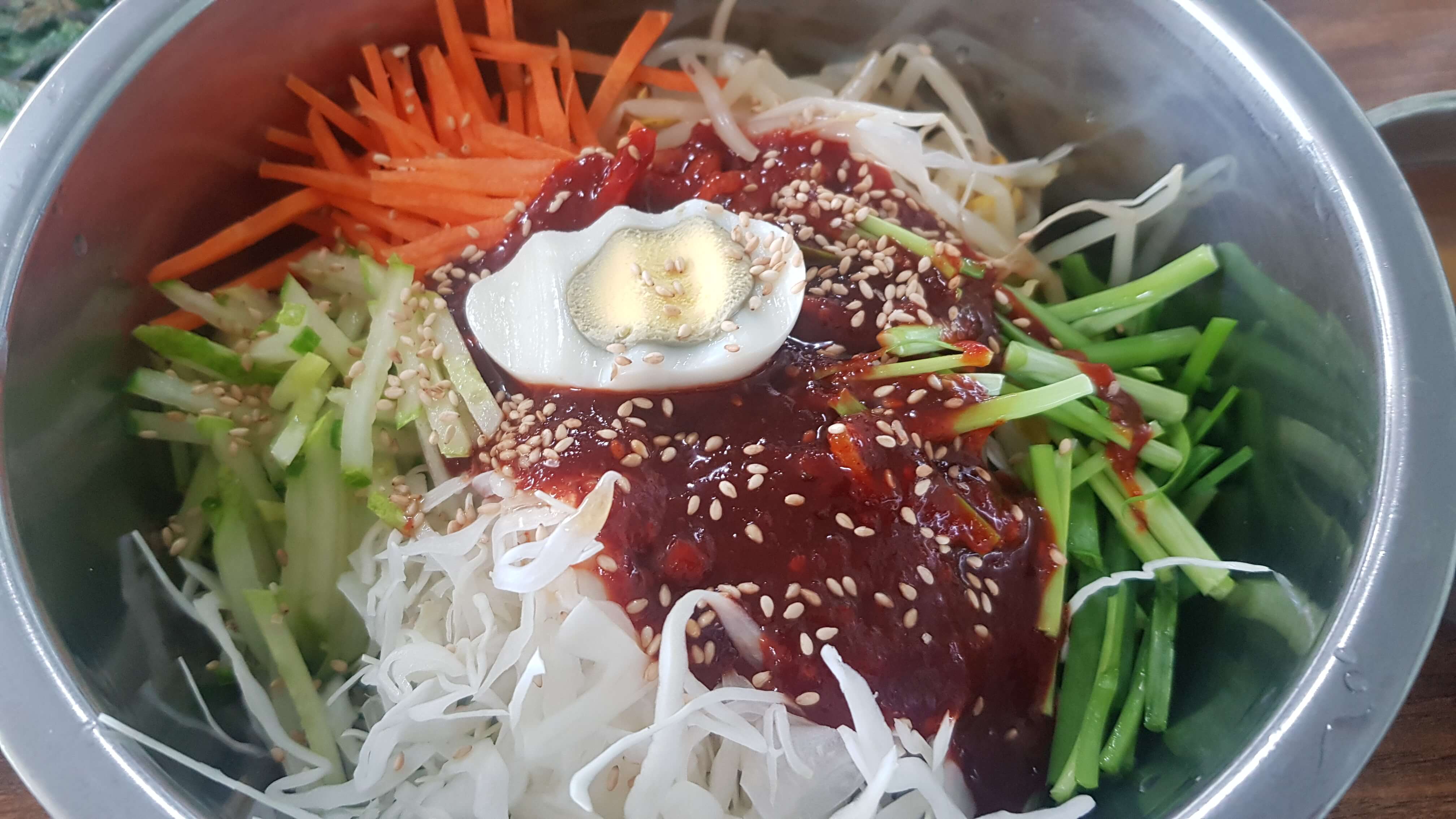 다시 비빔국수로 돌아왔습니다 당근과 오이 양배추 부추 콩나물 계란 양념장이 어우러진 야채비빔국수라 할수 있겠죠