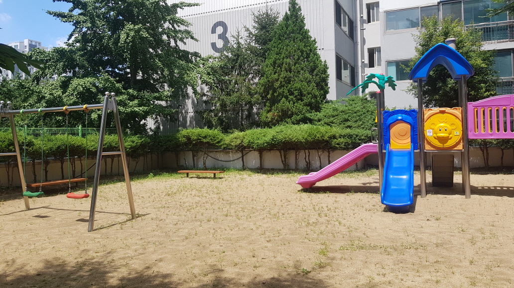 대림2,3동과 똑같은 구조로 계단을 올라오면 1동도 어린이놀이터가 모래로 깔려있습니다 더워서 아이들도 안노나보네요