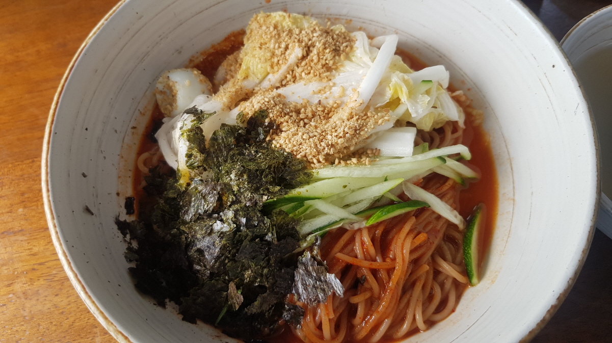 특별히 흠을 잡을 부분이 별로 없었어요 도토리국수베이스인데도 찰기도 느껴지고 쫄면직전의 쫄깃함에다가 정말 더도 덜도 아니게 정확히 삶아진 느낌... 먹으면서도 다음엔 무슨 국수에 도전할까 이런 생각이 절로 들더라고요