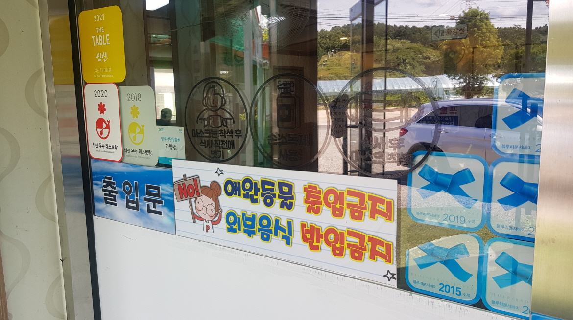 막줄래국시 출입문엔 20년의 식당의 훈장들이 새겨져있습니다