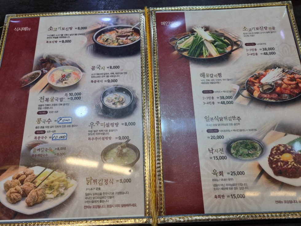 곰국시 전복굴국밥 닭튀김정식 소고기보신탕전골 해물갈비찜 낙지전 육회 설렁탕등 선택의 폭이 넓어요