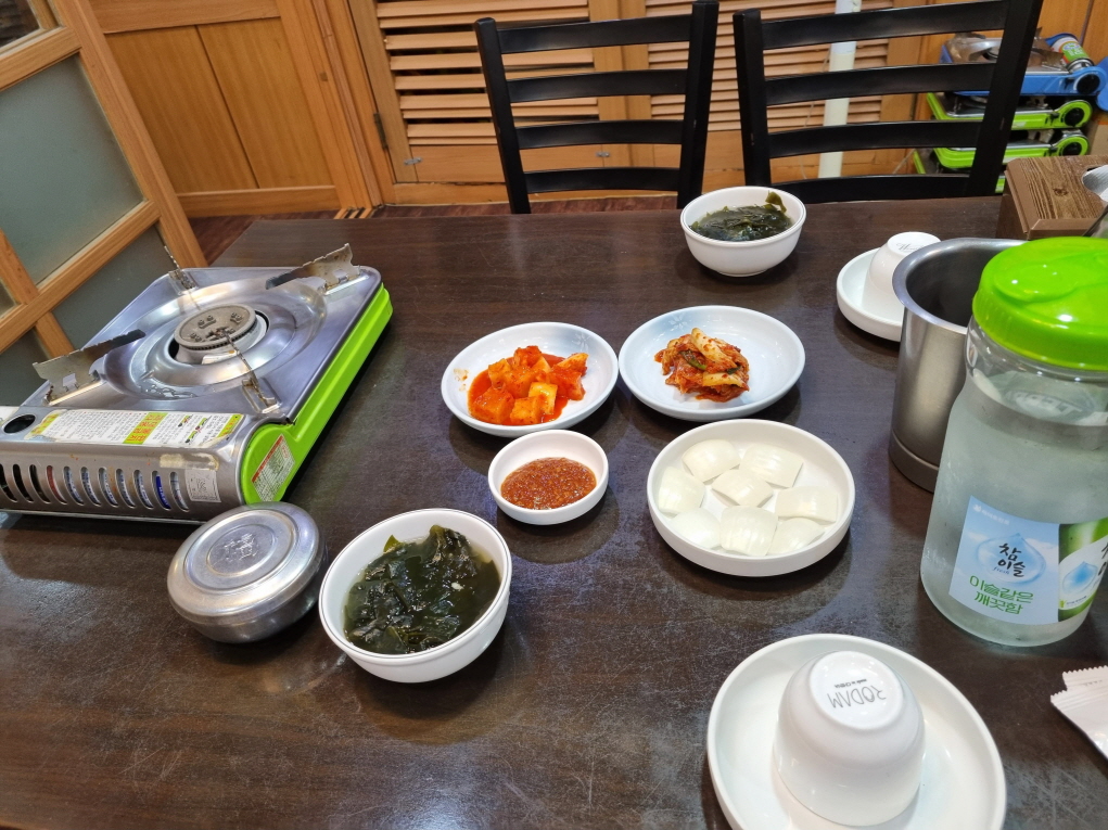 우주미의 기본테이블세팅입니다 미역국 김치 깍두기 양파 멕시칸샐러드