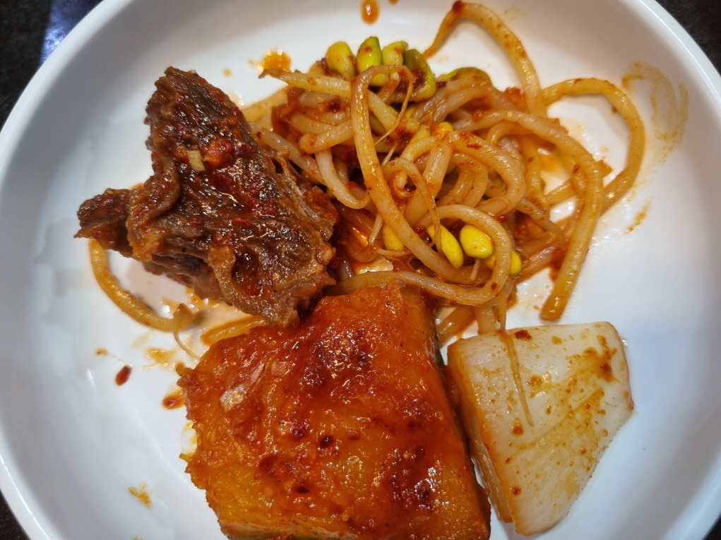 갈비찜과 콩나물 단호박 양파 한접시 덜어서 먼저 살짝 먹어보고요...살짝 매콤한 맛이 아주 일품 그 자체!