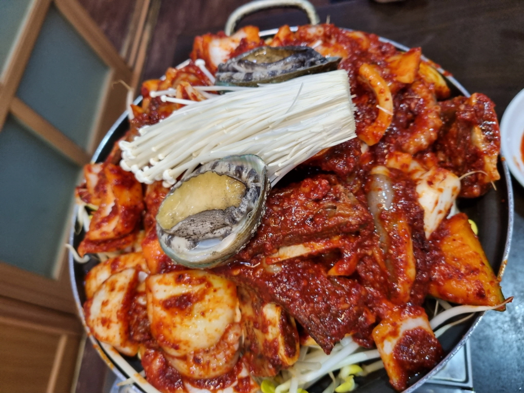 낙지와 떡 전복도 잘라서 같이 냠냠합니다 군더더기 없는 깔끔한 맛...그렇게 맵지 않아요