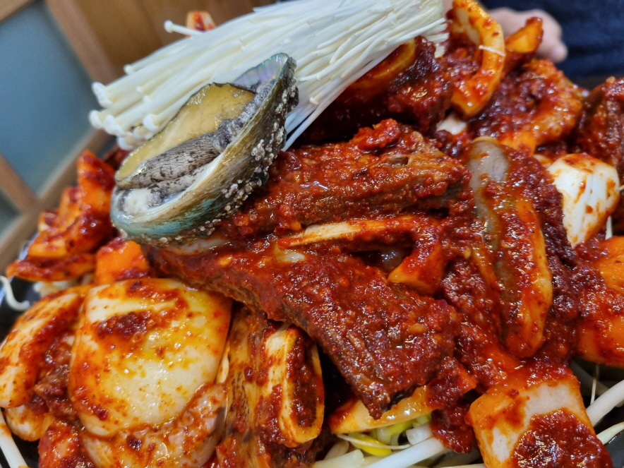 소갈비찜과 콩나물 양파 전복 버섯 새우 낙지 단호박 떡이 조합된 살짝 매콤한 해물갈비찜이예요